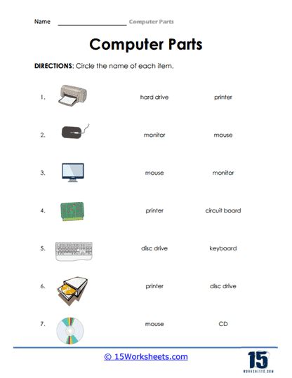 Computer Components Worksheet. If your kid doesn't already know the parts of a computer like the back of his hand, give him a fun review. This resource contains 6 worksheets for students to label the exterior parts of a computer, internal parts.