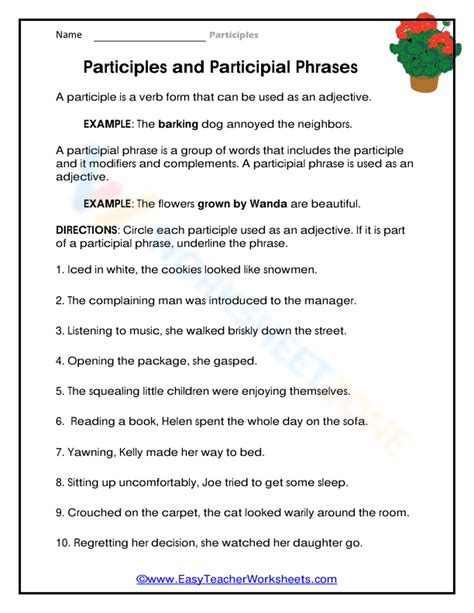 Identifying write it where it stands and then write it on the line too. Look at each verb below. Web participle phrase examples #1) the sobbing child held his injured knee. Web sentence squasher read each sentence and point out where the participle or participial phrase is. Web participle phrases can allow us to combine sentences and forge connections between related ideas. The runner was breathing heavily. ( sobbing is the present participle. Web participles and participial phrases. Exercise #1 name:________________________________________________________________ part i directions: In this helpful grammar worksheet, students will review the definition and examples of participles and participial phrases before. If it looks like a present participle,.
